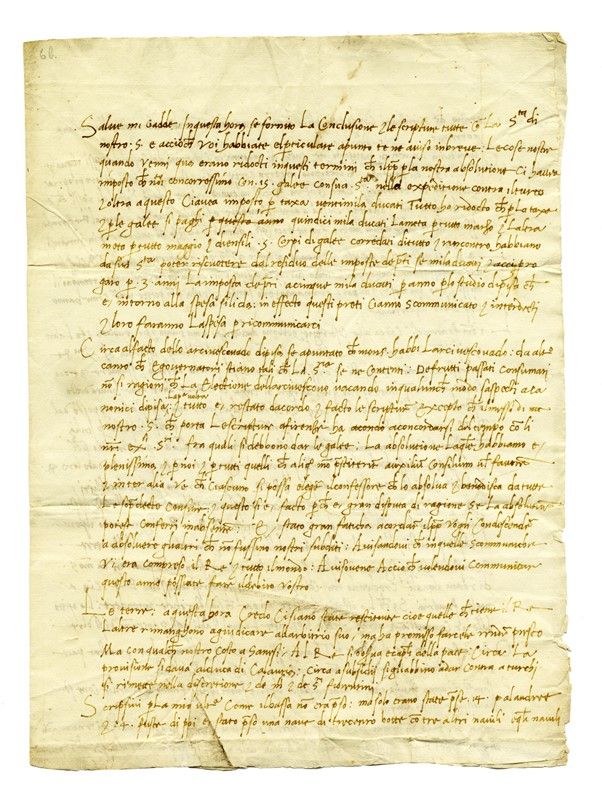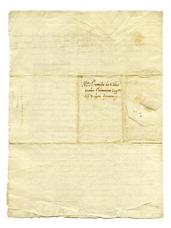 Manoscritto a inchiostro bruno. 1 bifolio, scritte 3 pagine (scritte 70 righe in totale). Testo italiano e latino. Al verso della seconda carta il nome del destinatario: Magnifico Francisco de Gaddis oratori fiorentino Dignissimo Apud Regem Francorum. Sigillo in carta conservato. Dimensioni: 300x220 mm.
