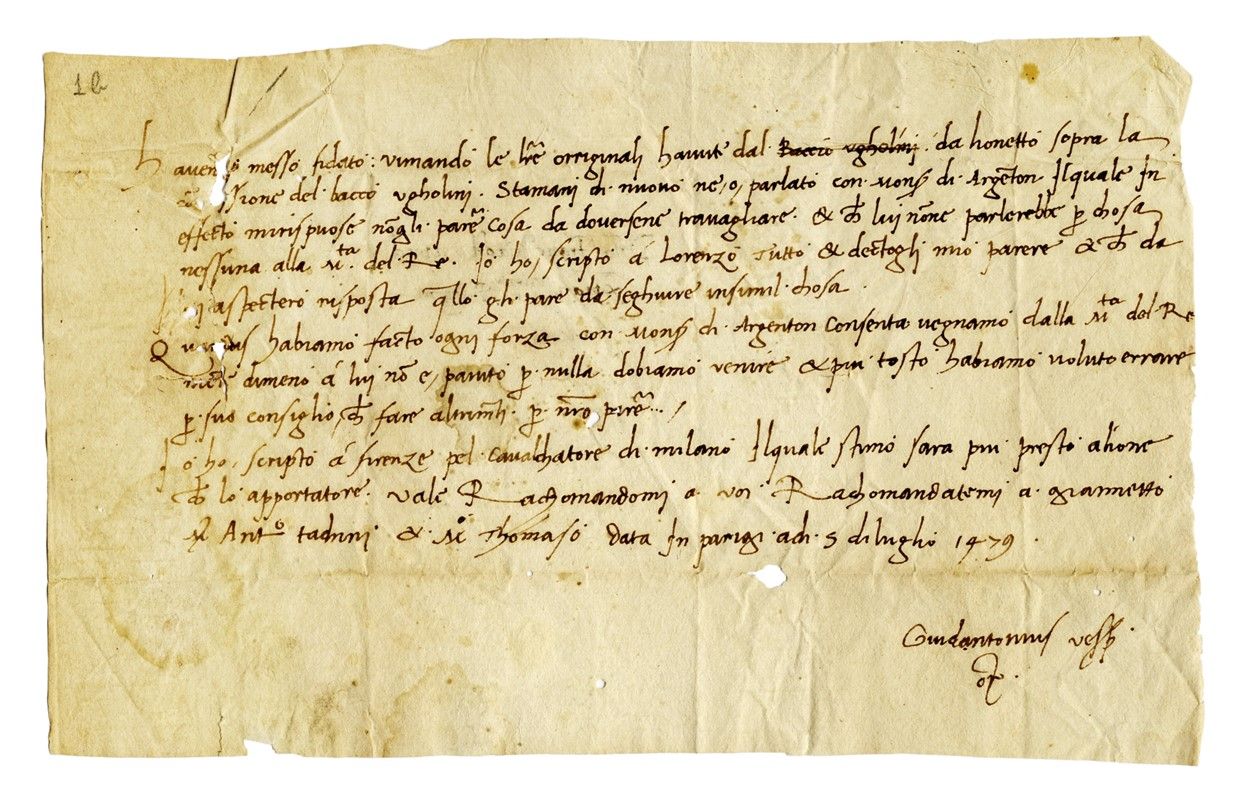 Manoscritto a inchiostro bruno. 1 carta scritta al recto (scritte 12 righe in totale). Al verso: Domino Francisco Gaddo apud Cristianissinum Regem Francorum. Testo in italiano e latino. Piccole mancanze di carta con perdita di testo. Tracce di sigillo. Dimensioni: 134x212 mm.