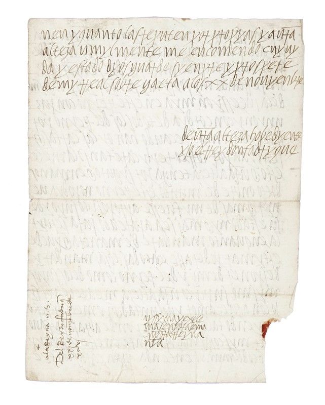 Manoscritto a inchiostro bruno. 1 carta scritta recto e verso. Con intestazione Serenissima y exelentissima senyora mya [...]. Al verso 4 righe conclusive della lettera, la firma El Rey don Fadrique, l’indicazione del destinatario Illustrissima y exelentissima senyora e [..] reyna [...] e di altra mano antica Ala Reyna N.S. Testo in spagnolo. Traccia di sigillo in ceralacca. Carta con filigrana con una piccola mancanza al margine inferiore sinistro. Lettera conservata in cartella rigida insieme ad altra cartelletta sulla quale è indicato: Comprata da Albi Rosenthal, Londra nel 1966. Dimensioni: 285x210 mm.