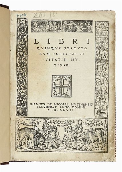 In folio (mm 296x205). Carte [6], XLII, CXXXX, [1] di [2]. Frontespizio entro ampia cornice xilografica, capilettera in legno nel testo. Carta 2C3 e 2C4 marginalmente restaurate, alcune carte con pecette di rinforzo, assente l'ultima carta bianca. Legatura moderna in mezza pelle con piatti in carta decorata e decorazioni a secco al dorso. Numerazione manoscritta a penna sul frontespizio, nel testo postille di mani diverse.