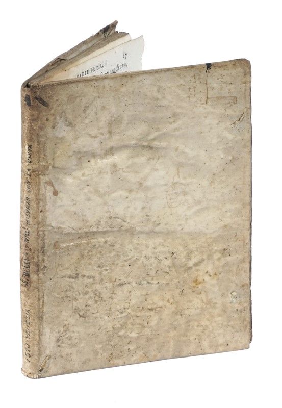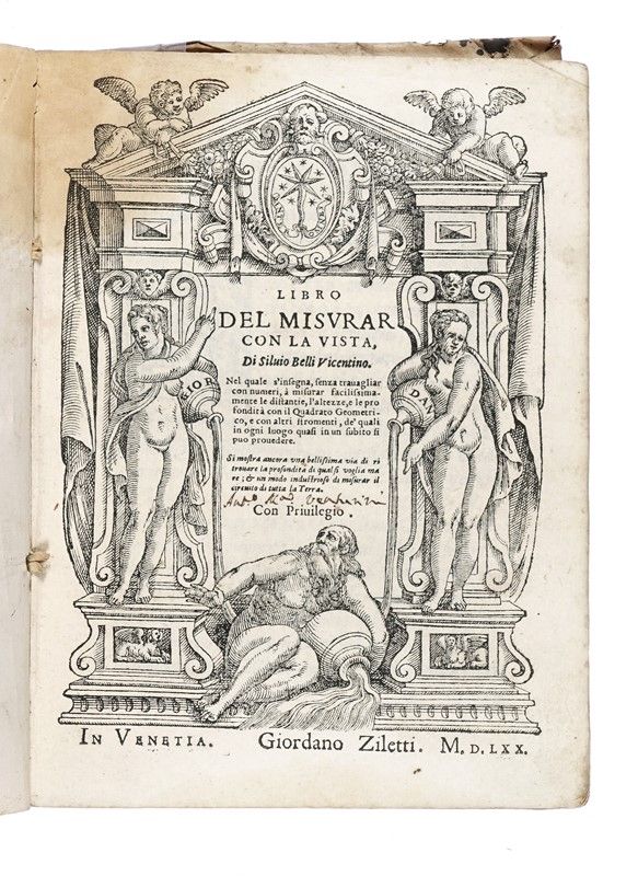 In-4° (mm 205x150). Pagine [8], 131, [3], 2 bianche. Bel frontespizio architettonico xilografico, grande legno raffigurante Tolomeo al colophon e moltissime illustrazioni nel testo. Copia macchiata nel margine superiore interno delle carte, nei fascicoli centrali un lavoro di tarlo in corrispondenza della macchia, ma copia completa e genuina. Legatura coeva in piena pergamena floscia con titolo manoscritto al dorso. Legatura leggermente allentata.