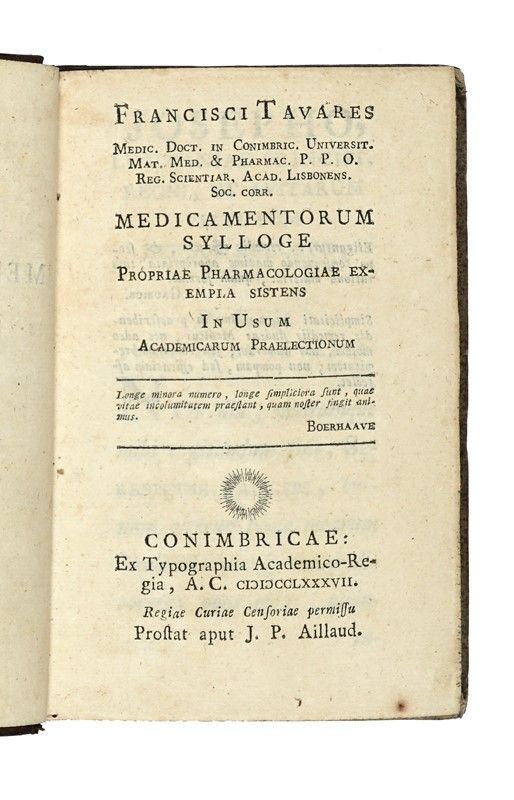 In-8° (mm 145x95). Pagine [32], 343, [1]. LEGATO CON: Id., De pharmacologia libellus. Conimbricae: ex Typographia Academico-Regia, 1786. Pagine [16], 299, [2], 1 bianca. Piccolo lavoro di tarlo nel margine superiore della seconda parte, per il resto ottima copia. Legatura in mezza pelle con piatti in carta decorata e titolo in oro su tassello al dorso.