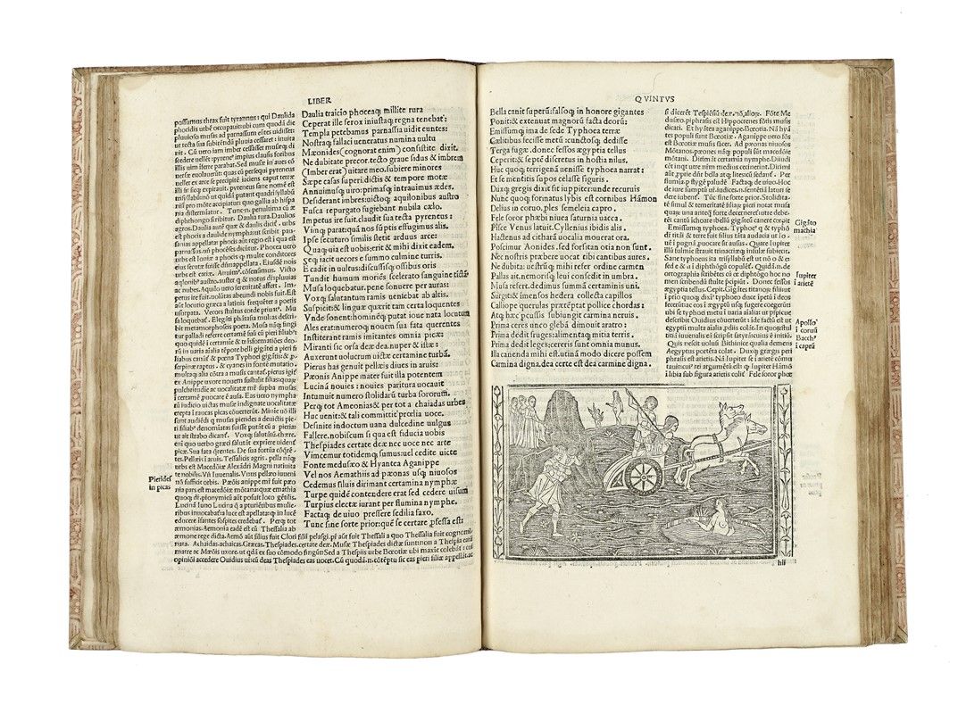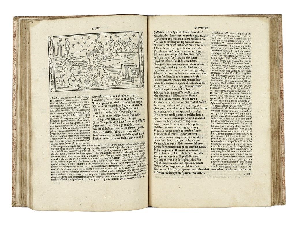 In-folio (mm 312x205). Carte [174]. Capilettera e belle vignette xilografiche nel testo. Mancanti le carte y7-y10, contenenti un'altra lettera di Raffaele Regio e il colophon. Esemplare ricomposto, con le prime 8 carte, contenenti i Preliminari, appartenenti dell'edizione veneziana delle Metamorfosi del 1517 di Giorgio Rusconi, con contenuti quasi identici all'edizione parmense del 1505. Prime e ultime carte dei preliminari leggermente brunite, gore agli ultimi fascicoli e restauri, con perdite di inciso, alle carte x7-x8 e all'intero fascicolo y, e senza perdite alla carta A1. Legatura in mezza pelle moderna con piatti in carta decorata e timbro a secco di precedente proprietario al piatto anteriore. Tracce d'uso alle cerniere. Annotazioni ai contropiatti.