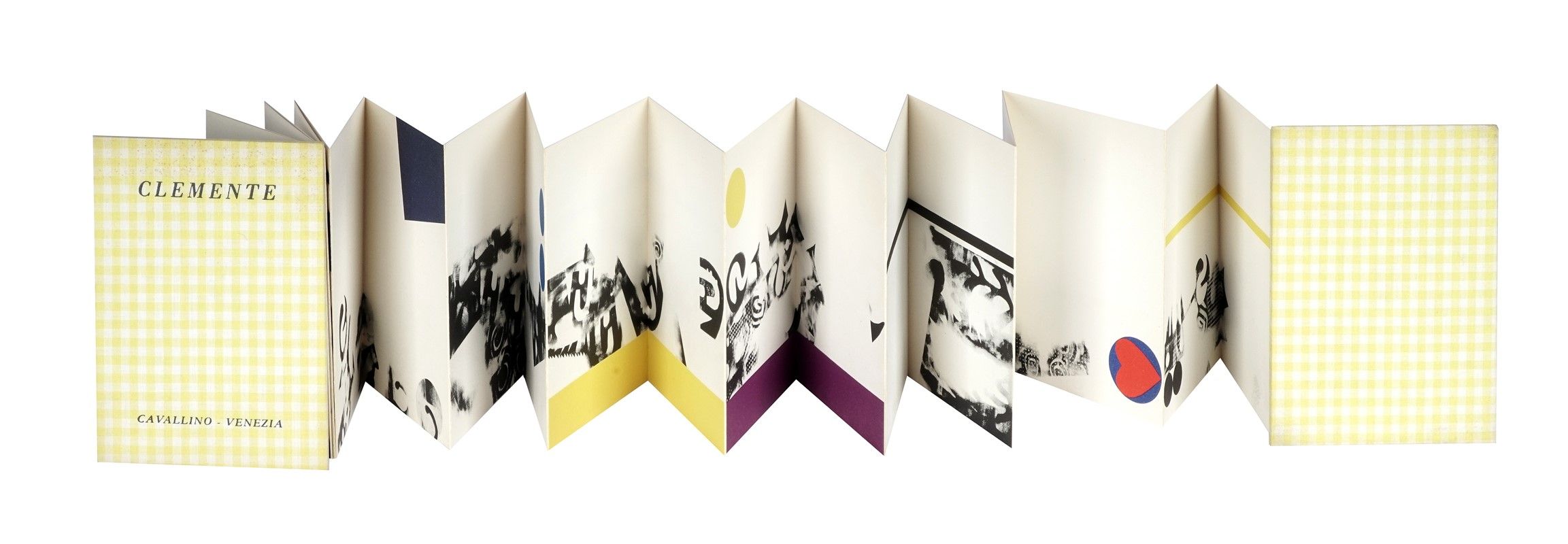 In-8° (chiuso: mm 147x100; aperto: mm 147x2400 ca.). 1 carta di frontespizio, 1 di colophon e 20 carte interamente litografate, applicate su cartoncino. Legatura editoriale con piatti in cartonato rigido rivestiti in tela, con sguardie decorate e fascetta editoriale in cartoncino. Edizione in 200 esemplari, numerati e firmati a matita da Jack Clemente.