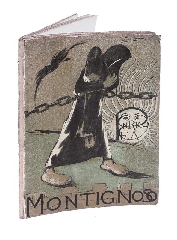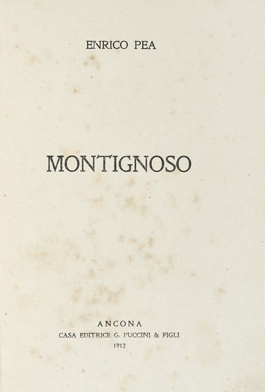 In-4° (mm 240x165). Pagine 113, 3 bianche. Fioriture diffuse e un'ampia piega alle ultime carte, per il resto buon esemplare in barbe. Brossura editoriale originale impressa a più colori a firma Lorenzo Viani. Difetti in corrispondenza della cerniera del piatto anteriore e una piega a quello posteriore. Con una bella dedica autografa di Enrico Pea, all'amico Enrico Amoretti, alla prima carta bianca.