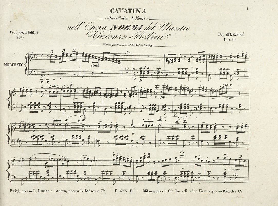 In folio oblungo (245x330 mm ca.). Frontespizio entro cornice stampata in rosso. Fascicoli legati tra loro e protetti da una brossura bianca moderna. Stato di conservazione delle carte molto buono. SI AGGIUNGE: Bellini Vincenzo. Norma. Milano, Giovanni Ricordi 1832. Numeri di lastra 5777-5786.
