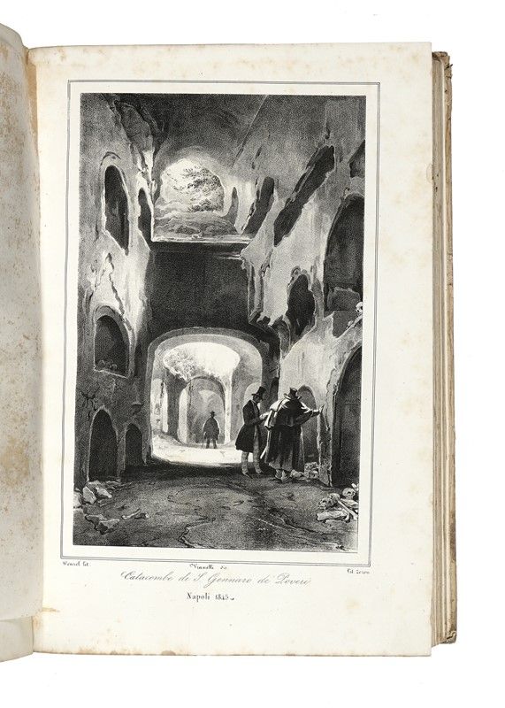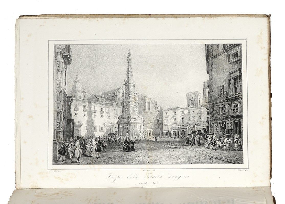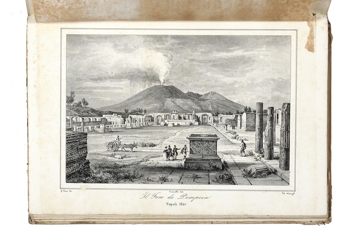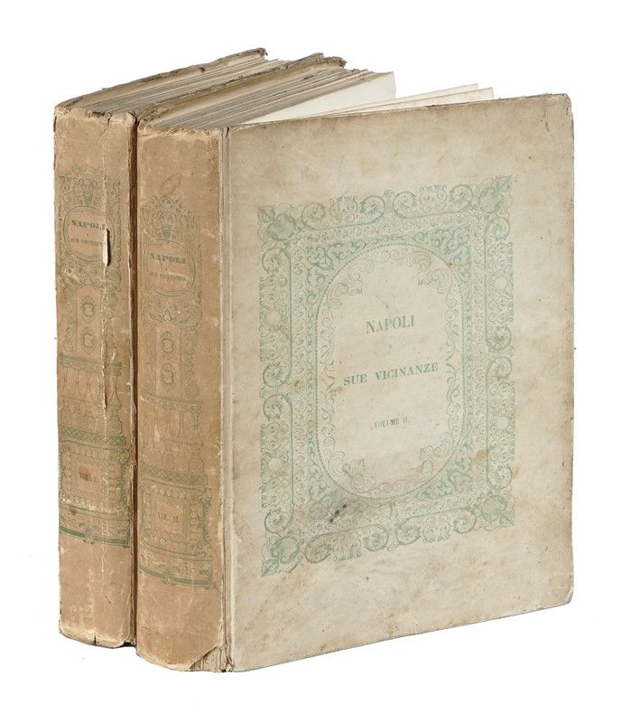 2 volumi in-4° (mm 280x190). Pagine [12], 542 [i.e. 540, per salto nella numerazione] + 15 tavole litografiche fuori testo protette da velina e 1 pianta di Napoli più volte ripiegata rilegata in fine, in coloritura successiva; 602, [2], XXII, [2] di indice delle illustrazioni + 10 tavole litografiche fuori testo protette da velina, 1 Pianta dell'antica Città di Pompei e 1 Carta de' contorni di Napoli più volte ripiegate. Ampie fioriture, concentrate principalmente al primo volume e alle veline del secondo, e altre mende. Grazioso cartonato editoriale con titoli e decori impressi in inchiostro blu entro ampie cornici a motivo fitomorfo, con segni di usura, bruniture e mancanze al dorso. Annotazione manoscritta al foglio di guardia anteriore.