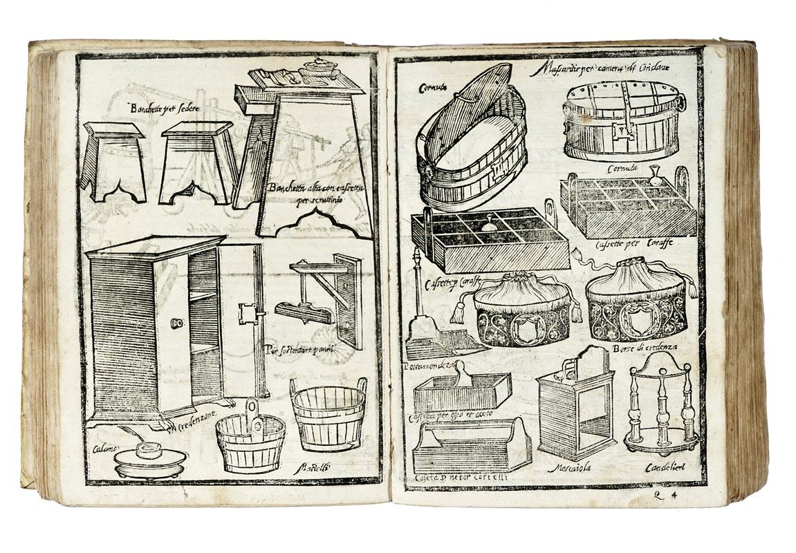 In-4° (mm 198x145). Carte [4], 122, [14], 123- 310. Marca xilografica al frontespizio, ritratto dell'autore a carta a4v e 14 carte di illustrazione xilografica di utensili per cucinare, cucine e banchetti. LEGATO CON: Cervio Vincenzo, Il trinciante. In Venetia: appresso Alessandro Vecchi, 1604. Carte [4], 39. Lieve gora nel margine superiore dei fascicoli, altra gora più evidente negli ultimi fascicoli del volume, copia leggermente corta di margini. Assente l'ultima parte, censita dal frontespizio, del Mastro di casa. Legatura coeva in piena pergamena floscia con titolo manoscritto al dorso. Alcune piccole mancanze in corrispondenza della cuffia superiore. Note di possesso manoscritte nella carta di guardia anteriore.