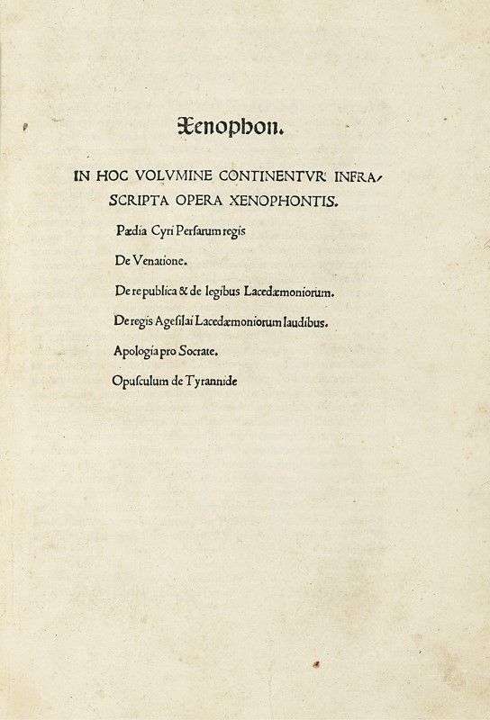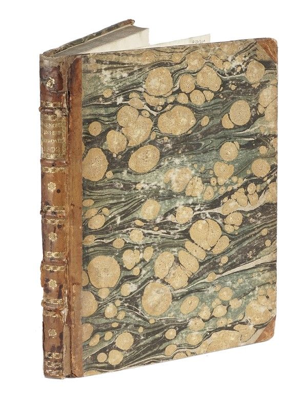 In-folio (mm 294x202). Carte [110] (l'ultima bianca). Marca tipografica in legno al colophon. Esemplare postillato, con occasionali e leggere fioriture e macchie. Legatura successiva in mezza pelle con piatti marmorizzati, titoli e fregi in oro al dorso a 5 nervi. Abrasioni ai piatti e difetti alle cerniere. Due ex-libris cartacei applicati al contropiatto anteriore.