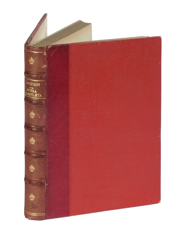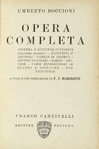 In-16° (mm 192x32). Pagine [2] bianche, [2], VII, [1], 334, [2]. Con, fuori testo, 1 ritratto dell'Autore in bianco e nero in antiporta e 12 tavole con fotoriproduzioni delle opere di Boccioni, di cui 10 in bianco e nero e 2 a colori ripiegate. Parzialmente staccata, ma presente e ben conservata, l'antiporta, altrimenti buona copia. Legatura in mezza pelle, con titoli in oro al dorso a 5 nervi. Minimi difetti.
