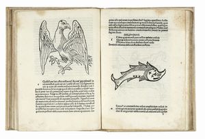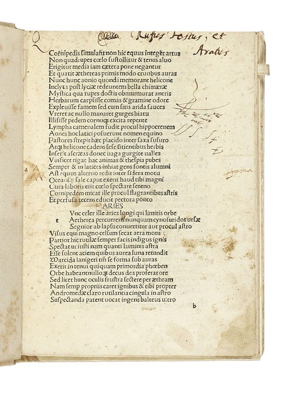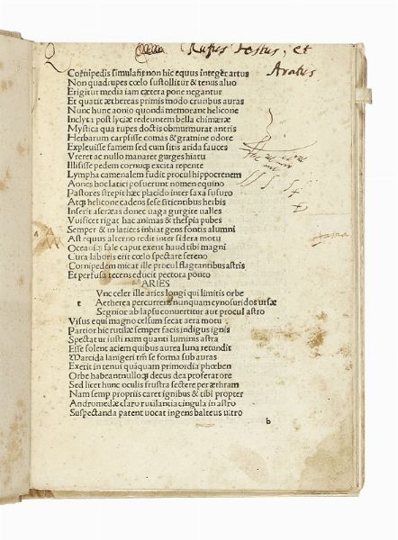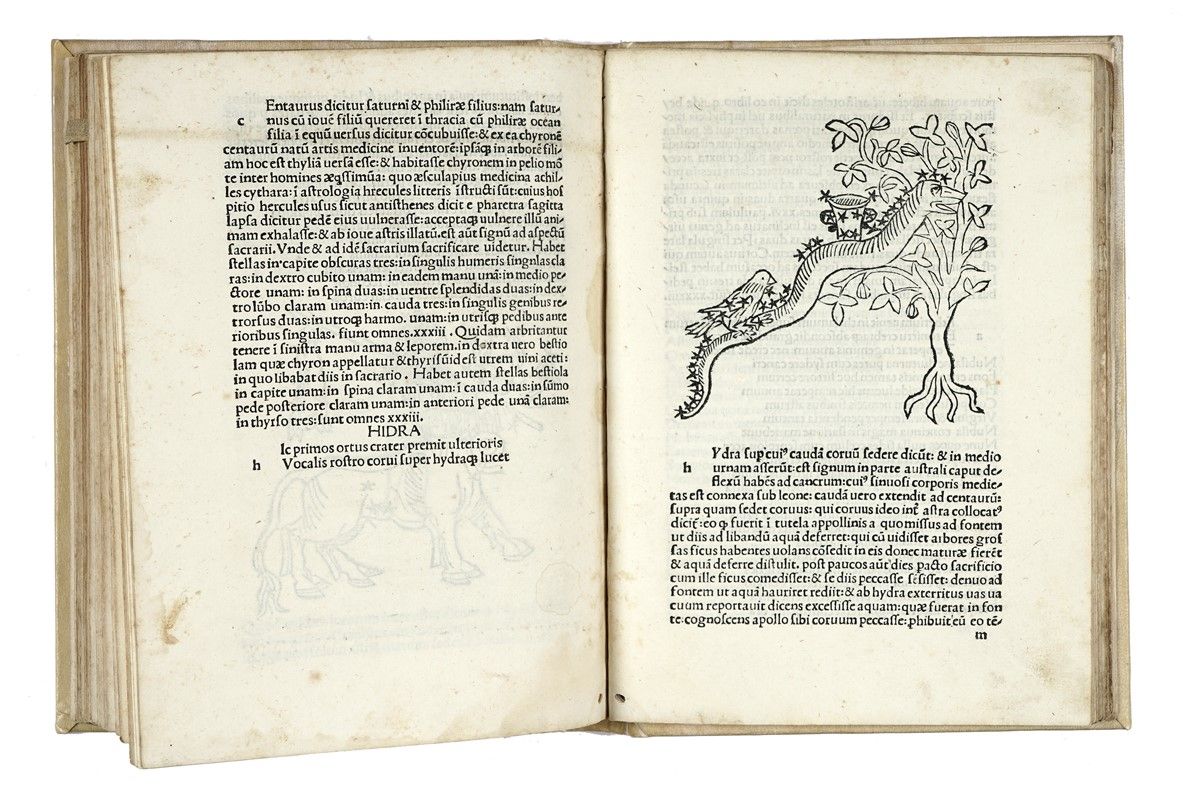 In-4° (mm 205x148). Carte 108 (di 122), mancano 10 carte di testo e 4 carte bianche. Segnatura: a10 b-p8. Mancano a1-a10, g1, g8, p7-p8. Testo in carattere tondo (R 84) su 38 linee. Spazi per capilettera con letterine guida. Con 38 illustrazioni di segni zodiacali e costellazioni a mezza pagina nel testo. Qualche fascicolo brunito, forellino di tarlo e poi esile lavoro marginale ai quaderni l-n, altre minime mende. Legatura moderna in piena pergamena antica con titoli impressi in nero su tassello pergamenaceo al dorso. Ex-libris Carpaneto e Lusini applicati al contropiatto. Alcuni schizzi e glosse di antica mano al testo.