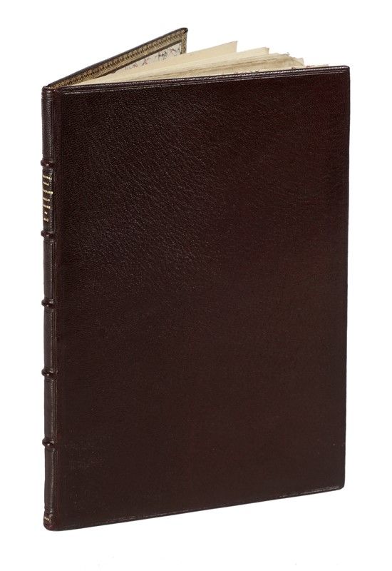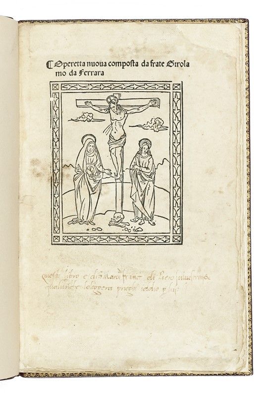 In 4° (mm 218x147). [22] carte. a-b8 c6. Collazionato completo. Vignetta xilografica al frontespizio e a c1r. Marocchino moderno testa di moro con filetti a secco, dorso a nervi con titolo in oro, dentelle dorata, sguardie marmorizzate. -- Frontespizio un po’ polveroso e con piccoli risarcimenti all’angolo in alto a destra e lungo il margine inferiore, una pallida macchietta, qualche postilla coeva in margine, leggere tracce d’uso al margine inferiore su qualche carta. -- Provenienza: antica nota di appartenenza al frontespizio ("questo libro e di […] Marco di Franct di Piero filius […] / qualunche loleggera prieghi iddio p. lui"); etichetta della Libreria Antiquaria Pregliasco; note a matita al recto della sguardia volante posteriore (tra cui "Comprato per Natale nel 1971 da Pregliasco di Torino").