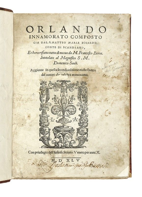 In-4° (mm 213x150). Carte 238. Frontespizio con piccole mancanze reintegrate con carta, uno strappo a carta B4 (senza perdite), occasionali carte marginalmente macchiate, macchie più consistenti negli ultimi fascicoli di testo. Legatura ottocentesca in mezza pelle con piatti in carta decorata e titoli in oro al dorso. Timbro di precedente proprietario al foglio di guardia in principio di volume (sguardie rinnovate.
