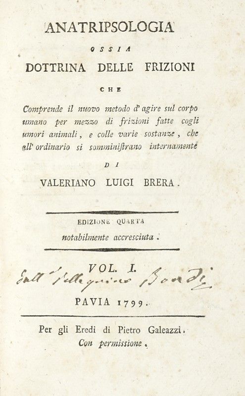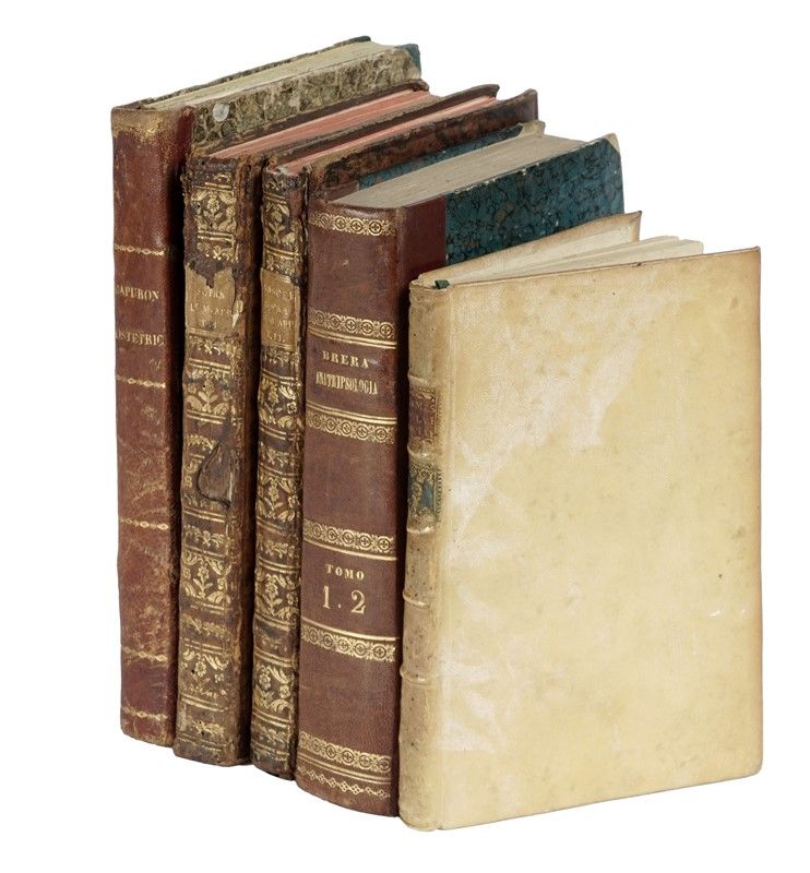2 volumi in-8° (mm 210x140). Pagine 24, 224 [di 225] con 1 antiporta incisa e 1 tavola ripiegata in fine; 162 con 9 tavole fuori testo, in parte ripiegate. Primo volume privo dell'ultima carta di testo, con la tavola ripiegata strappata (senza perdite), per il resto buono stato. Legatura coeva in piena pelle con titoli e impressioni in oro al dorso, tagli rossi. Sguardie in carta marmorizzata. Mancanze lungo cuffie e cerniere. SI AGGIUNGONO: James, Metodo di amministrare la polvere antifebbrile. Napoli: s.e., 1799. In-8° (mm 178x115). Brera Valeriani Luigi, Anatripsologia ossia dottrina delle frizioni. Vol I (-II). Pavia: per gli eredi di Pietro Galeazzi, 1799. 2 parti in 1 volume in-8° (mm 203x125). Capuron F., Corso teorico e pratico di ostetricia. Venezia: dalla tipografia di Paolo Lampato, 1834. 1 volume in-8° (mm 225x115).
