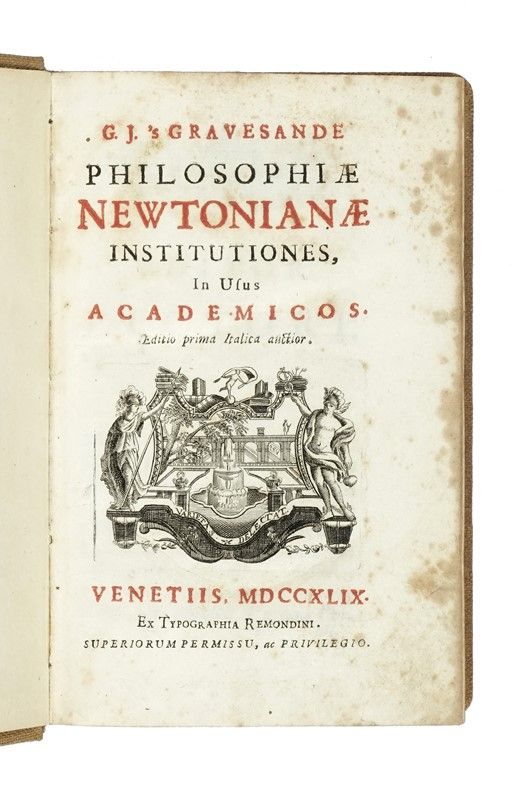 Due parti in un volume in-8° (mm 174x110). Pagine [28], 244, [3], 246-571, [21]. Con 18 tavole incise ripiegate fuori testo. Frontespizio in rosso e nero, con marca tipografica in rame; testatine, capilettera e finalini in legno. Mancante la carta χ1 bianca. Fioriture diffuse, anche alle tavole; la n. VI con uno strappo marginale restaurabile. Legatura successiva in piena tela muta; sguardie rinnovate, con ex-libris in carta, applicato al foglio di guardia anteriore e parzialmente mancante.