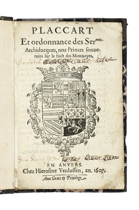 In-12° (mm 150x97). Carte [39], 1 bianca. Nel testo numerose illustrazioni a piena pagina con raffigurazioni di monete e medaglie. Difetti marginali, buono stato complessivo. Legatura moderna in mezza pelle con punte e piatti in carta marmorizzata. Titolo in oro al dorso. Alcune mancanze in corrispondenza delle cuffie. Ex-libris di precedente collezione al contropiatto anteriore, note manoscritte cassate al frontespizio.