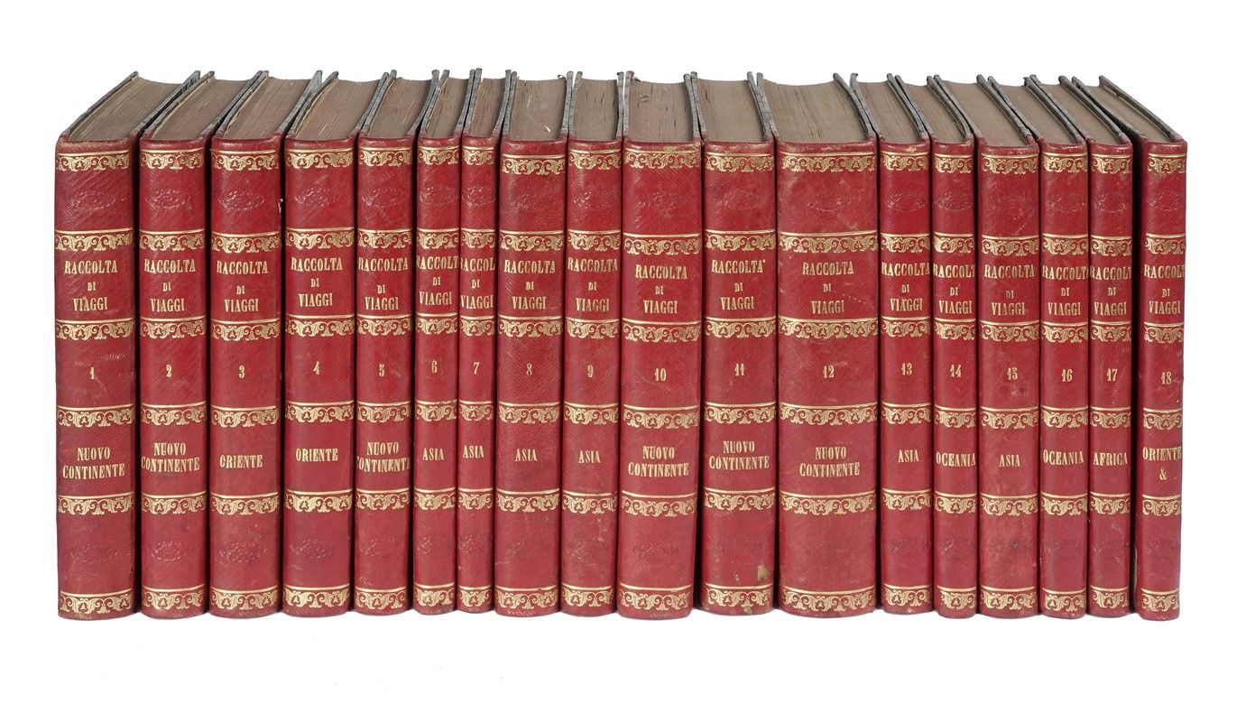 18 volumi in-8° (mm 230x145). Con numerose mappe e vedute in calcografia fuori testo. Buono stato conservativo. Bella legatura coeva, omogenea, in mezzo marocchino rosso con piatti in carta marmorizzata e titoli in oro al dorso.