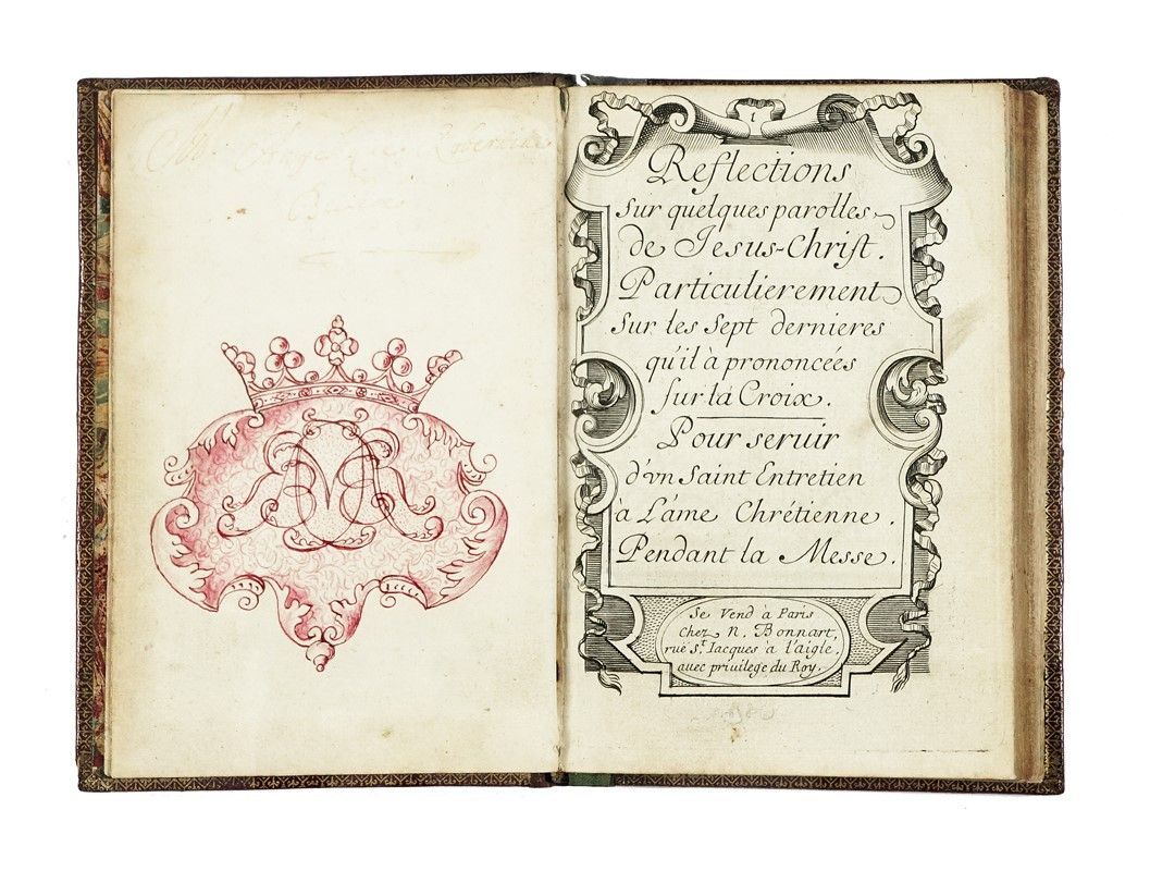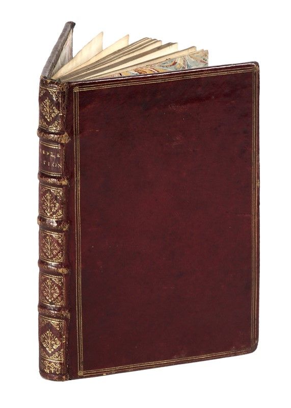 In-12° (mm 158x100). Pagine [2], 100. Testo interamente impresso in calcografia, con numerose vignette nel testo raffiguranti vedutine, fiori e raffigurazioni religiose. In principio e fine di volume aggiunti due stemmi disegnati a inchiostro rosso. Occasionali tracce d'uso sui margini delle carte ma ottima copia, ben impressa e completa. Legatura in pieno marocchino rosso con cornici di filetti impressi in oro ai piatti e titoli e decorazioni dorati sui comparti del dorso. Dentelles e tagli oro, sguardie in carta marmorizzata (rinnovate). Due ex-libris di precedenti collezioni applicati al contropiatto anteriore.