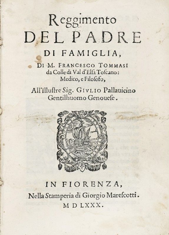 In-4° (mm 210x152). Pagine [80], 561, [1]. Assente l'angolo inferiore esterno della carta d2 con piccola porzione d'inciso, qualche occasionale fioritura e lieve gora marginale, per il resto buona copia. Assente l'ultima bianca. Legatura coeva in piena pergamena floscia con titolo manoscritto al dorso. Nota di possesso non più leggibile al frontespizio.