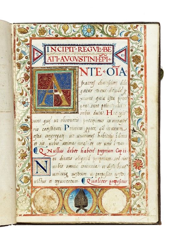 Manoscritto pergamenaceo impreziosito da decorazioni miniate. 28 pagine in pergamena (22 scritte); 4 fogli di guardia in carta. Testo in latino. Legatura in pelle marrone, con impresse cornici dorate e armi, cimate con triregno e chiavi, di papa Gregorio XIII, al secolo Ugo Boncompagni (1501/2 - 1585). Al risguardo, ex libris di Leo Samuele Olschki. Conservati nastri di chiusura. Dimensioni: 150x210 mm.