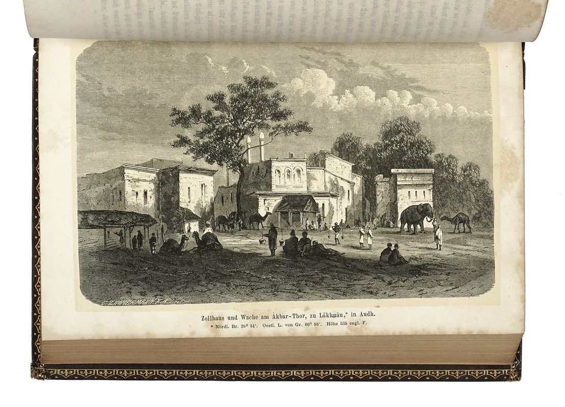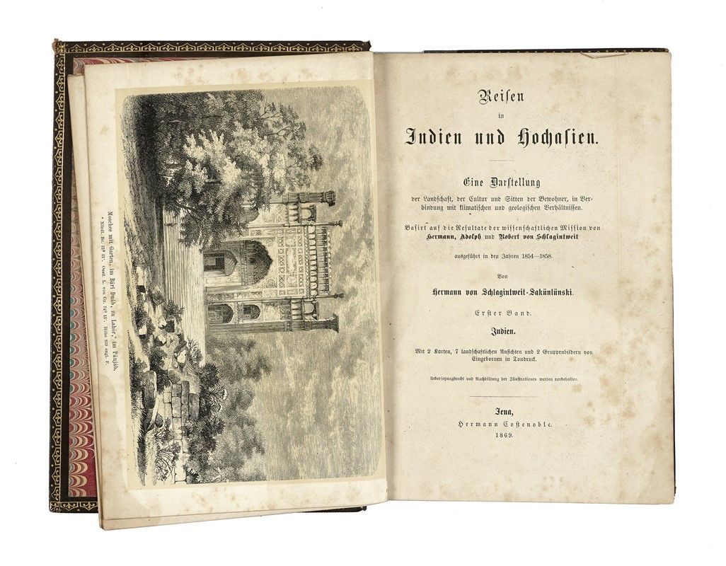 4 volumi in-8° (mm 224x148). Pagine XVIII, 589, [2], 1 bianca + 1 antiporta, 9 tavole fuori testo protette da velina, 1 carta geografica a colori più volte ripiegata; XXXVI, [2], 473, 1 bianca, [2] + 1 antiporta e 9 tavole fuori testo, di cui 3 più volte ripiegate e 6 protette da velina; XXI, 1 bianca, [2], 344, XI, [1] bianca + 9 tavole fuori testo, di 4 più volte ripiegate e 5 protette da velina; XV, 1 bianca, [2], 556, [2] + 8 tavole fuori testo, di 3 più volte ripiegate e 5 protette da velina. Ottimo esemplare, con diffuse e usuali fioriture e uno strappetto marginale senza perdite alla Karte des Westlichen Hochasien al terzo volume. Legatura coeva in piena pelle, con cornici dorate ai piatti, fregi e titoli al dorso a 5 nervi, dentelles alle unghiature, sguardie in carta marmorizzata e tagli in oro. Lievi abrasioni alle cuffie e alle cerniere, altrimenti buona conservazione.