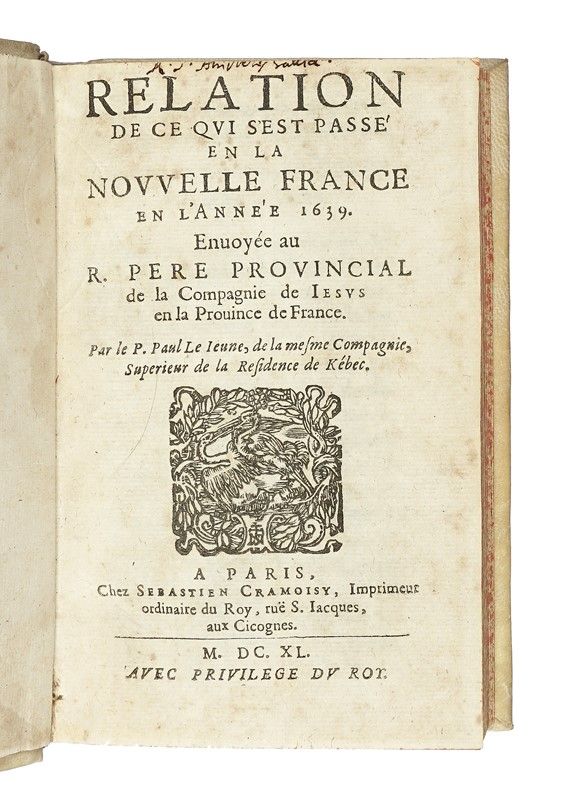 [CON:] Lalemant, Jérôme. Relation de ce qui s'est passé dans le pays des Hurons. In 8° (mm 164x106) in 2 parti. Pagine [6], 166, [2], 174 [2]. Collazionato completo, con “cancels” e varianti descritte da McCoy. Marca tipografica di Cramoisy al frontespizio, fregi e iniziali xilografici. Frontespizio rifilato con perdita di antica firma di appartenenza, qualche pallida fioritura occasionale, qualche macchietta, margine superiore un po’ corto. Pergamena rigida settecentesca con tassello dorato al dorso, tagli spruzzati di rosso.