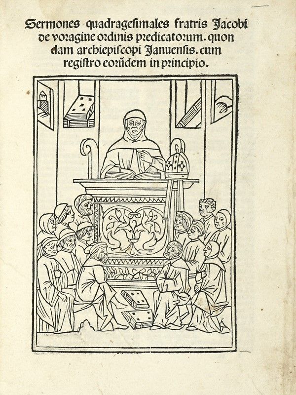 In 8° (mm 157 x 118). [10] 117 [1] carte. a10 2a-2o8 2p6 (ultima bianca). Collazionato completo. Al frontespizio grande xilografia raffigurante vescovo assiso in cattedra con i discepoli ai lati, ripresa dall’edizione del 1497; marca tipografica in fine; testo in gotico su due colonne con capilettera xilografici. Pallida gora alla parte inferiore delle carte in fine e altre trascurabili tracce del tempo. Pergamena rigida coeva (qualche difetto).