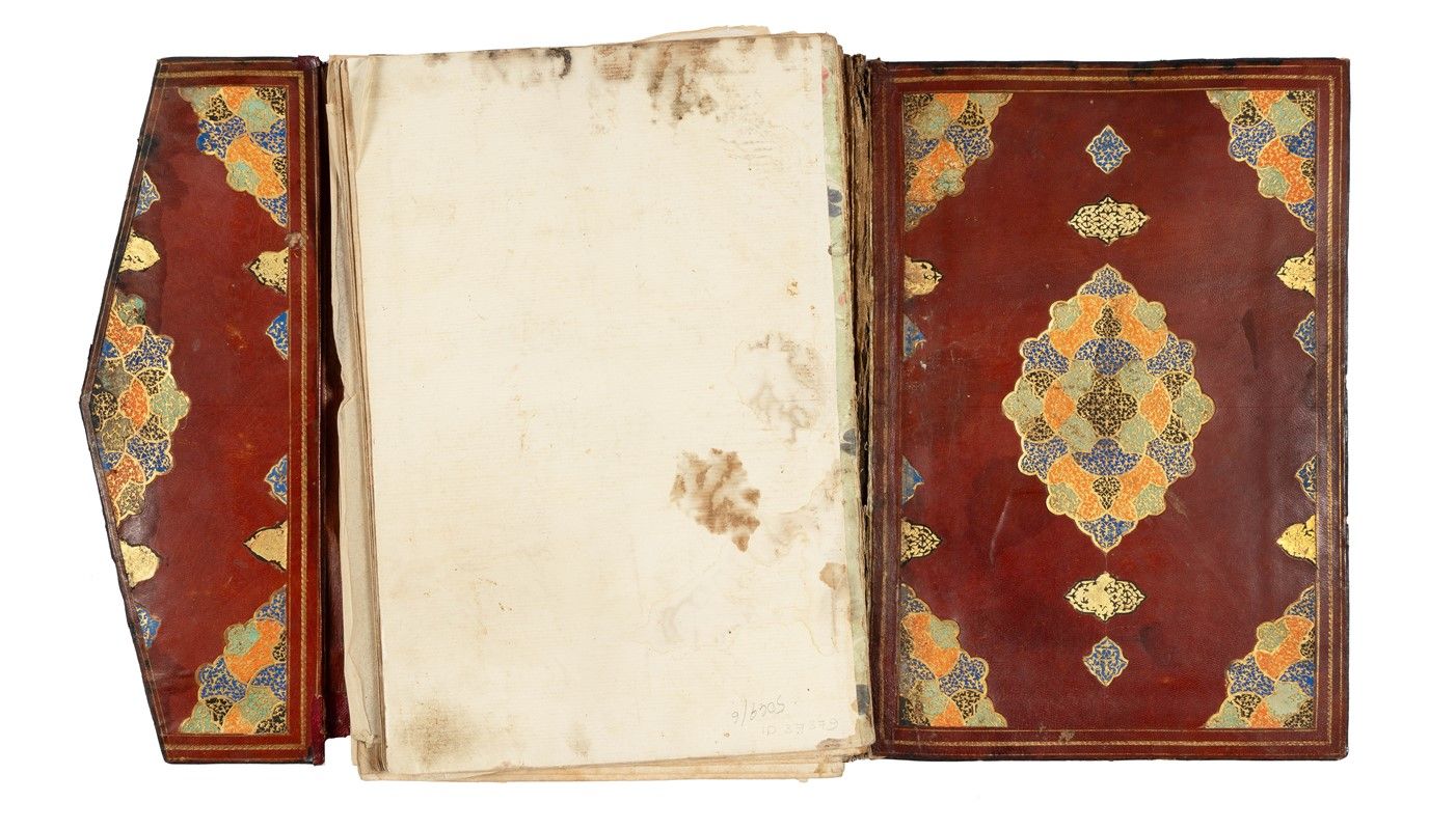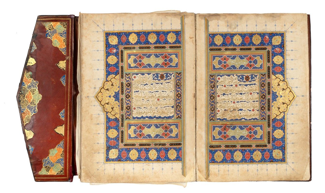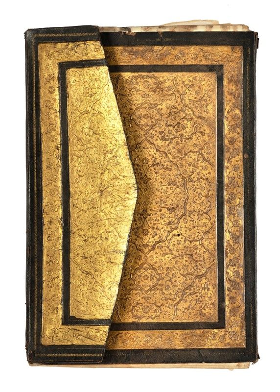 Manoscritto arabo pergamenaceo completo, misurante al foglio mm. 370 x 250 ca. (prossimo al formato qatc an-ni?f, analogo all’in-folio) e allo specchio di scrittura mm. 240 x 150 ca. (vicino a un qatc à-?ulu?) riportante integralmente il primo ?uzc del Corano (I, 1 – II, 141). Carte 23 complessive [2 + 46 + 2 facciate]: 2 sguardie iniziali e 2 finali cartacee, vergellate, filigranate e di fattura europea coeva. Il codice non reca alcun colophon né altra esplicita notizia su datazione o provenienza, né sull’identità di committente o scriba. L’analisi degli elementi formali induce ad attribuirne la provenienza alla Persia orientale, verosimilmente all’area di Her?t, oggi nell’Afghanistan occidentale, e a datarlo verso il finire del XVI secolo (1570 -90), in piena età safavide. Testo in arabo coranico scritto in stile mu?aqqaq a modulo piuttosto ampio con sapiente finezza calligrafica disposto su 8 righi di testo a facciata e privo di reclamantes, vergato all’inchiostro nero e oro a righi alterni ad eccezione della doppia pagina di apertura (ar.: ?unw?n) interamente in crisografia (ar.: tà??b). Il contenuto consiste nella prima di 30 ripartizioni di identica ampiezza (ar.: ?uz?) destinate a una varietà di usi liturgici quali, ad esempio, la scansione recitativa quotidiana del libro sacro durante il mese di Ramà?n. I versetti di questo primo ?uzc si estendono dal v. 1 della S?ra I (al-F?ti?a, "la Aprente"), fino al v. 141 della S?ra II (al-Baqara, "la Vacca"). La prima Sura del Corano riveste la massima importanza per tutti i musulmani, di qualsiasi denominazione siano: è essa la più salmodiata e memorizzata, e costituisce una sorta di piccola summa dell’attitudine islamica nei confronti del Divino. Quanto ai vv. 1-141 della Sura "della Vacca", essi pongono a tema la distinzione tra credenti e miscredenti, la creazione dell’uomo e i miti narrativi sull’origine del male: dalla prima ribellione di Satana nel suo rifiuto di prosternarsi di fronte all’essere umano alla disobbedienza di Adamo ed Eva, culminata nella cacciata dal Giardino. L’ultima parte del primo ?uzc tratta infine dei popoli eletti da Dio a conservarne e diffonderne il Verbo, in particolare degli Ebrei discendenti da Abramo. Opera di eccelsa maestria appare la preziosa legatura, dal piatto anteriore in pelle fornito di ribalta simile a una parete d’oro in foglia abbellito da finissimi arabeschi a rilievo bassissimo e ornato dalle tradizionali mandorle, due minori speculari centrate su una maggiore. Notevoli i contropiatti in marocchino, dall’intricata e sovrabbondante serie di intagli e intarsî metallici inseriti, colorati a vivacissime tinte alternanti. Questo favoloso codice si è preservato fino ad oggi in condizioni eccezionalmente buone, nonostante gore d’acqua evidenti sulle sguardie e assai più tenui al margine superiore dei fogli pergamenacei, e tracce d’uso concentrate agli angoli inferiori delle carte.