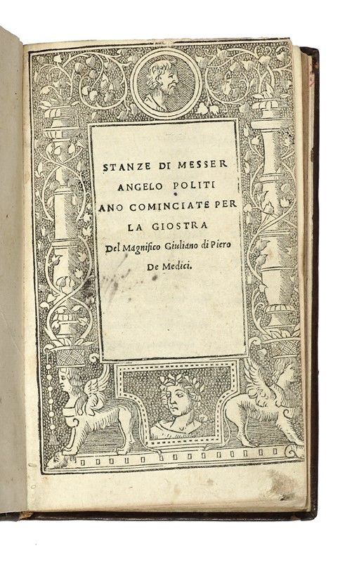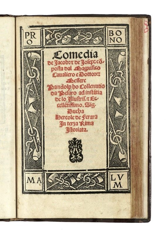 In-8° (mm 155x95). Carte [40]. Frontespizio xilografico, altra incisione a carta D3v. Perdita di piccola porzione d'inciso nel margine esterno del frontespizio. LEGATO CON: Collenuccio Pandolfo, Comedia... (Al colophon:) Stampata nella inclyta citta di Venetia: per Nicolo Zopino de Aristotile de Ferrara, 1525 adi XIX de mazo. Carte [76]. Frontespizio impresso in rosso e nero entro cornice xilografica, altri legni nel testo. Copia corta di margini. Legatura rimontata in piena pelle con impressioni a secco e iniziali "N.F." a entrambi i piatti. Sguardie rinnovate.