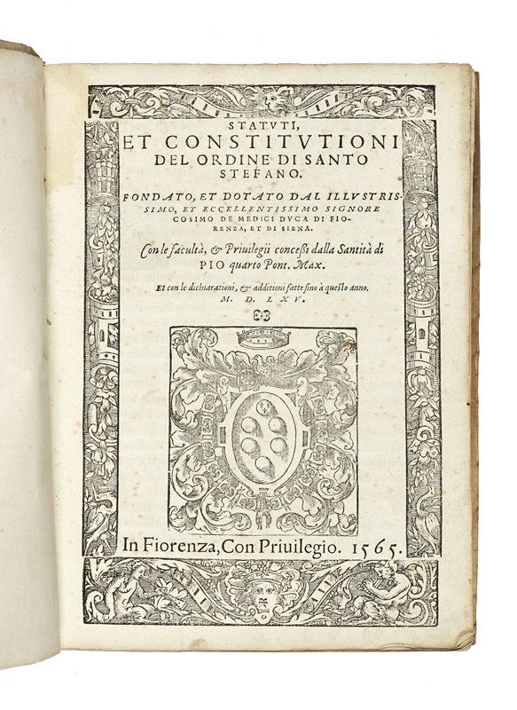 In-4° (mm 215x160). Pagine 158 [i.e. 159], [37]. Frontespizio entro cornice xilografica, in fine volume croce dei cavalieri di Santo Stefano impressa in inchiostro rosso. LEGATO CON: Statuti, ordini, riformazioni & addizioni del Capitolo Generale dell'anno 1566. In Fiorenza: per i Figliuoli di Lorenzo Torrentino & Carlo Pettinari Compagno, 1566. Pagine 16. LEGATO CON: Privilegia & facultates ab illustrissimo [...] Cosmo Medices... Religioni & militibus Sancti Stephani concessa, 1565. Florentiae: apud filios Laurentii Torrentini, 1566. Pagine 6, [1], 1 bianca. Sporadiche fioriture e bruniture, complessivamente buona copia, genuina e completa. Legatura coeva in piena pergamena floscia. Applicata al dorso etichetta cartacea (intervento moderno).