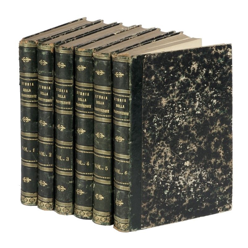 6 volumi in-8° (mm 200x125). Esemplare profusamente illustrato, con tavole fuori testo e 1 antiporta al primo volume. Sporadiche fioriture e altre minime mende, altrimenti ottimo stato conservativo. Legatura coeva in mezza pelle verde con piatti marmorizzati, titoli e fregi in oro al dorso. Segni di usura e qualche lieve mancanza a piatti e dorso, ma nel complesso buone condizioni.