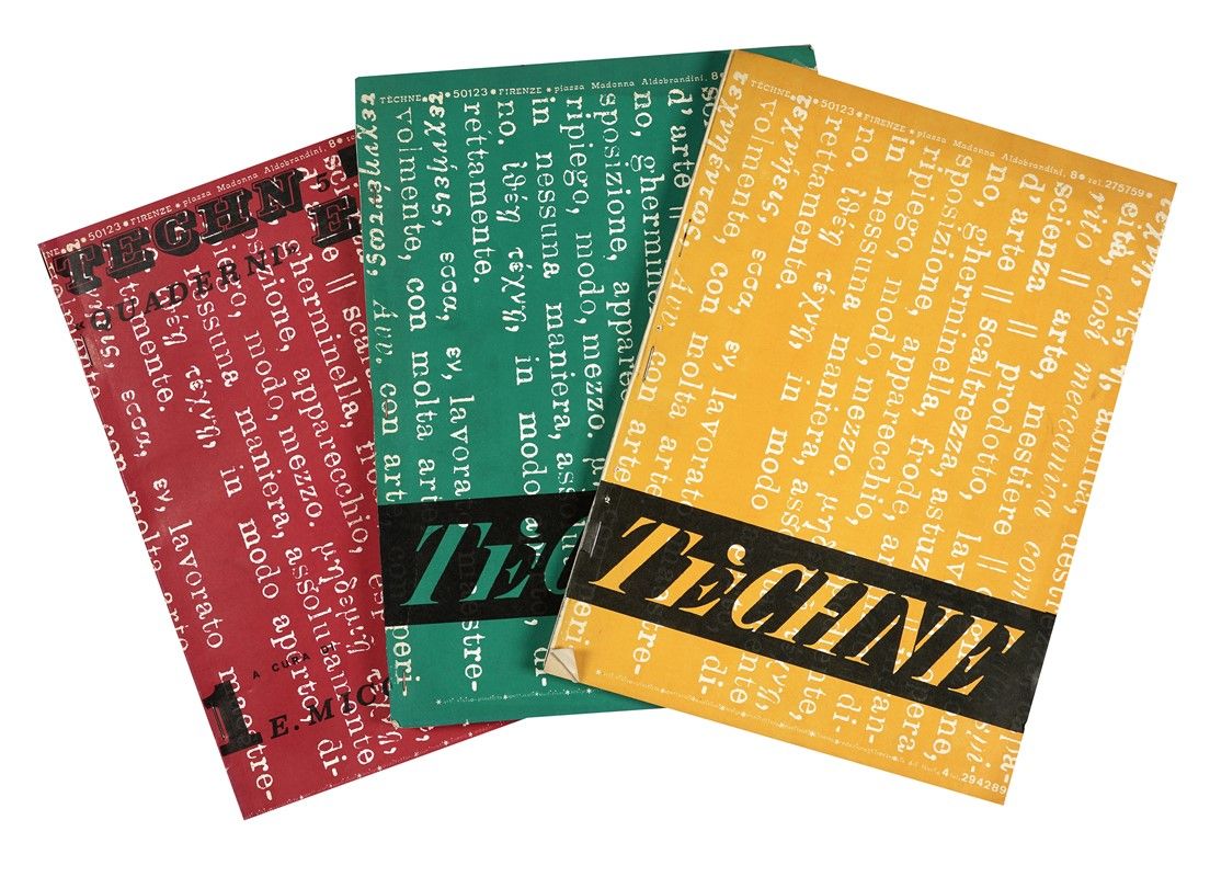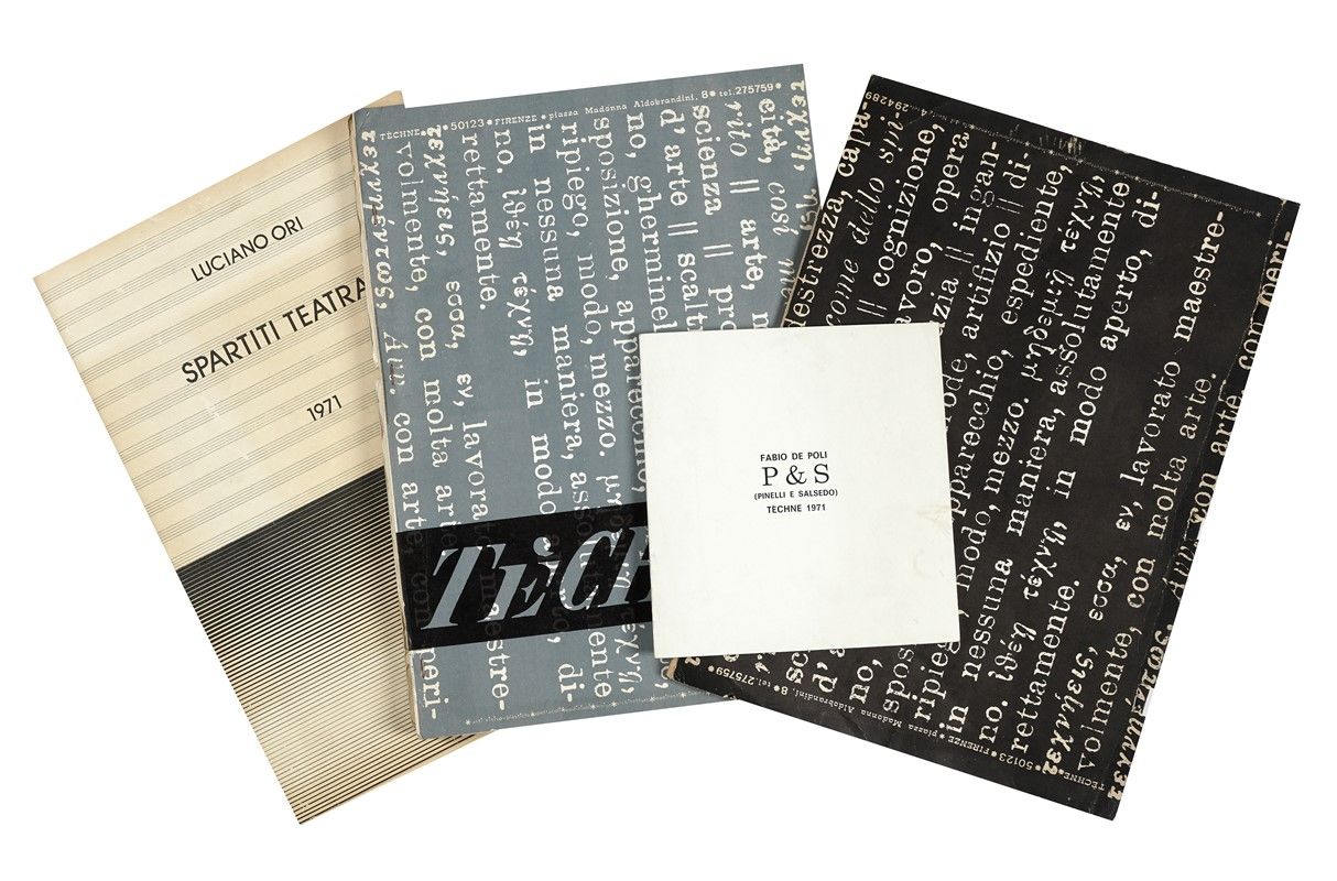 1) Techne. Numero 1. Firenze: Techne, 1969. Ciclostile spillato in-4° (mm 340x240). Brossura editoriale originale nera con testi impressi in bianco. Staccato, ma presente, il piatto anteriore. Contenuta all'interno parte della fascetta editoriale. 2) Techne. Numero 2. Firenze: Techne, 1969. Ciclostile spillato in-4° (mm 340x240). Brossura editoriale originale rossa con testi impressi in bianco. Parzialmente staccato il piatto anteriore e contenuta all'interno parte della fascetta editoriale nera. 3) Techne. Numero 3/4. Firenze: Techne, 1970. Ciclostile spillato in-4° (mm 340x240). Brossura editoriale originale verde con testi impressi in bianco. Difetti. (2 copie). 4) Quaderni di Tèchne, n° 5, marzo 1970. Teatro 1. Firenze: Téchne, 1970. Ciclostile spillato in-4° (mm 320x220). Brossura editoriale originale rossa, con testi in bianco e nero. Qualche difetto alla cuffia superiore, altrimenti ottima conservazione. 5) Techne. Numero 5/6. Firenze: Techne, 1970. Ciclostile spillato in-4° (mm 335x245). Brossura editoriale originale gialla, con testi impressi in bianco e nero. 6) Techne. Numero 7/8. Firenze: Techne, 1970. Ciclostile spillato in-4° (mm 335x245). Brossura editoriale originale grigia, con testi impressi in bianco e nero. Staccato, ma presente, il piatto posteriore. 8) Quaderni di Tèchne, n° 14, gennaio 1970. Teatro 2. Firenze: Téchne, 1970. Ciclostile spillato in-4° (mm 320x215). Brossura editoriale originale color crema, con testi in bianco e blu. SI AGGIUNGE: Ori Luciano, Spartiti teatrali. Firenze: Techne, 1971. SI AGGIUNGE: Id., Poesia Visiva: un no alla poesia. Milano: Mercato del Sale, 1975. SI AGGIUNGE: De Poli Fabio, Pinelli & Salsedo. Firenze: Edizione Techne, 1971.