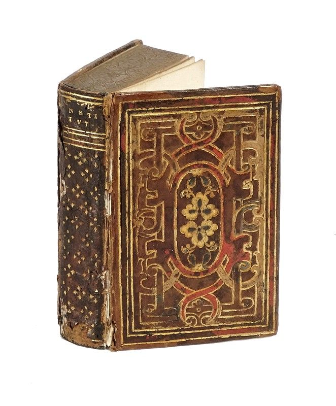 In-16° (mm 120x72). Pagine [12], 546, [6], [22] di [24] con 1 carta ripiegata fuori testo. Assente l'ultima bianca, copia con lievi e uniformi bruniture, più consistenti in rare carte. Testo riquadrato a inchiostro. Legatura coeva in piena pelle con ampie cornici impresse in rosso e oro ai piatti, titolo e piccoli ferri dorati al dorso, tagli dorati. Mancanze lungo le cerniere, sguardie rinnovate. Conservato entro cofanetto moderno in percallina con titolo su tassello al dorso.