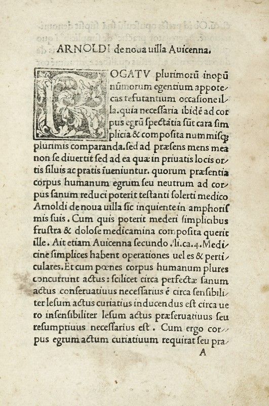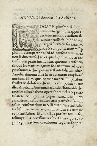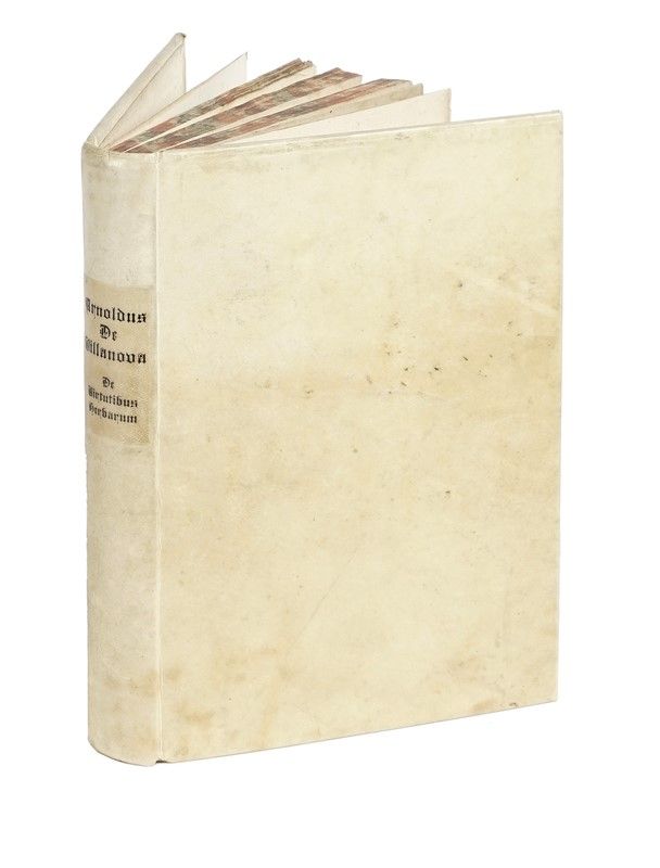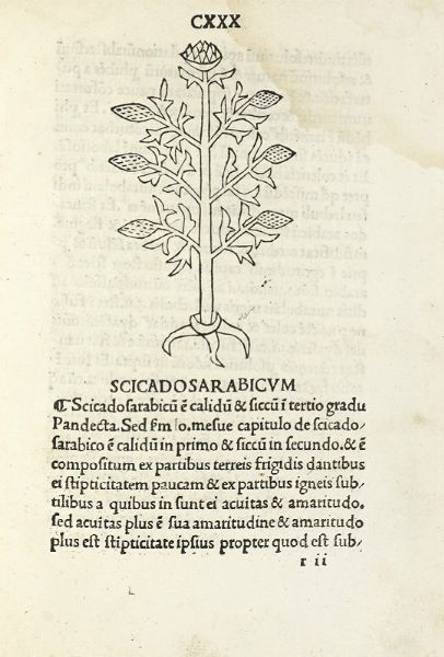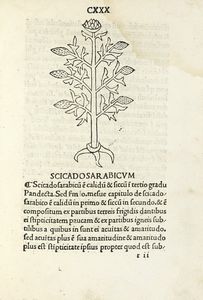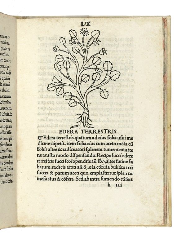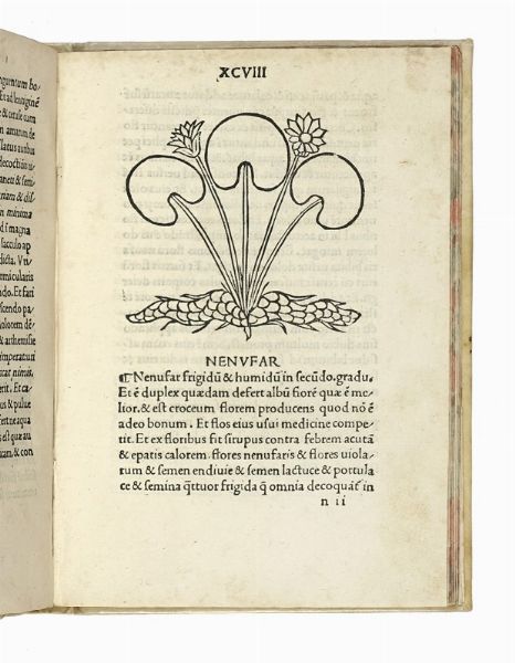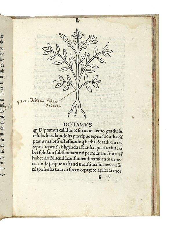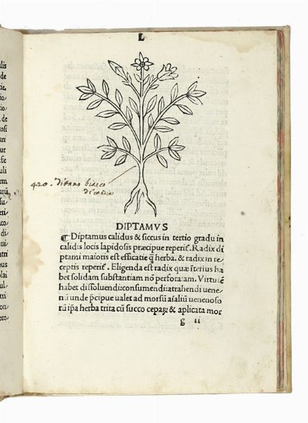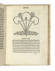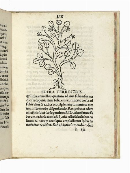 In-4° (mm 198x138). Carte [3] (di 4), CL, [17] (di 18, manca l'ultima bianca). Segnatura: A4 (-A1); a-x8 (-x8). Testo in carattere gotico e tondo (G 120, R 112) su 27 linee. Una grande iniziale decorata su fondo nero. Con 150 figure di piante incise in legno a mezza pagina nel testo. Esemplare scompleto del frontespizio (contenente il solo titolo: Incipit tractatus de virtutibus herbarum) e dell'ultima carta bianca, rifilato nel margine superiore con parziale perdita di alcuni numeri di carta, con arrossature sparse e gore d'acqua marginali in principio e in fine di volume. Legatura moderna in piena pergamena antica con titoli impressi in nero su tassello pergamenaceo applicato al dorso; conservati gli antichi fogli di guardia. Ex-libris Luigi Carpaneto e Bruno Lusini applicati al contropiatto anteriore. Molte annotazioni di mano cinquecentesca a margine delle figure, con la traduzione in volgare dei nomi delle piante.