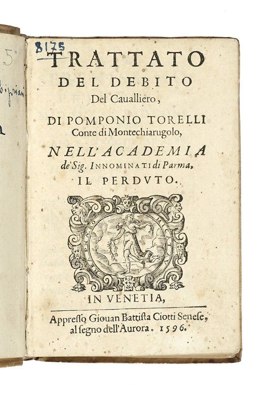 In-8° (mm 145x97). Carte [24], 166,2 bianche. Occasionali macchie, buono stato complessivo. Legatura coeva in piena pergamena floscia con titolo manoscritto al dorso e tassello cartaceo applicato in corrispondenza della cuffia superiore. Note manoscritte di antica mano sulle ultime due carte bianche e sulla sguardia posteriore.