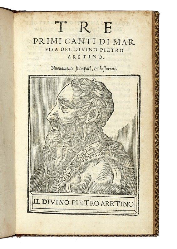 In 8° (mm 155x99). [52] carte. Collazionato completo. Ritratto xilografico dell’autore al frontespizio, testo in corsivo adorno di 6 vignette xilografiche, grande marca tipografica in fine (Essling n.1793, p. 182). Frontespizio un po’ stanco, carte leggermente ingiallite e con rare pallide fioriture ai margini. Marocchino oliva di Derome le Jeune (etichetta al verso della sguardia), piatti con cornice di triplo filetto dorato con stelline agli angoli, dorso liscio (un po’ sbiadito) con titolo in oro per il lungo, filetto dorato all’unghiatura, dentelle dorata, sguardie marmorizzate. Qualche abrasione alle estremità. Provenienza: ex libris ottocentesco "René Choppin"; altro ex libris, novecentesco, in marocchino rosso con iniziali "SBS". Alla sguardia volante posteriore, nota a matita con le seguenti provenienze: "L. G. Gaignat [cat., n. 2023]; B. Maglione [cat. I, n. 413]; R. Choppin [cat., I, n. 10] Baron Franchetti [cat. 1922, n. 76].