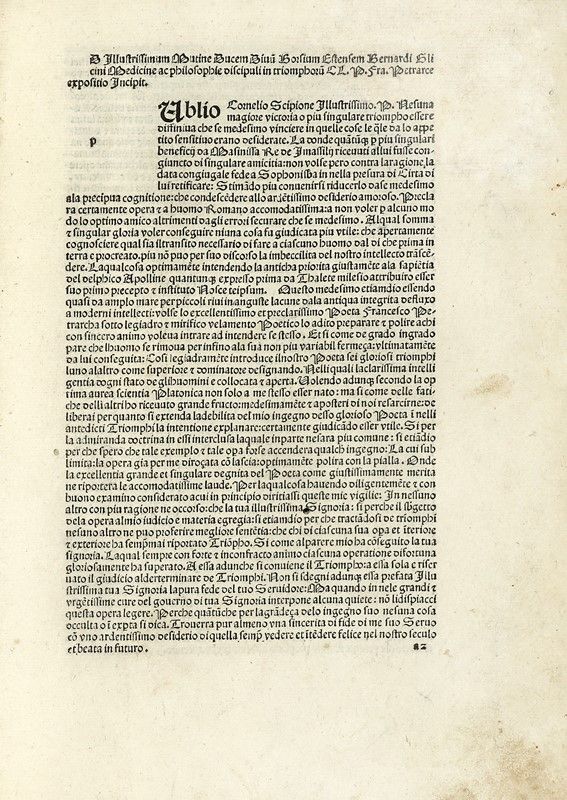 In folio (mm 295x205). Carte [195] di [196]. Segnatura: a10 (-a1 bianca) b8 c6 d-e8 f10 g8 h-i6 I8 k8 l-o6.8 p-s6 t10 2a8 2b-2f6 2g10. Testo (G 150 e G 77) su 51 linee. Spazi per capilettera. Copia priva della prima carta bianca, con un abile restauro che interessa il margine superiore del primo fascicolo, strappi richiusi alle carte g5, g6, strappi che interessano il testo nel margine inferiore delle carte m e n, mancanza di carta (senza perdite) a 2d. Gora lavata, in alcuni casi visibile, nell'angolo superiore esterno delle carte, per il resto buona copia. Legatura successiva in mezza pergamena con piatti in cartolato e titolo manoscritto al dorso. Alcuni forellini di tarlo ai piatti, sguardie rinnovate. Occasionali note manoscritte nel testo, lunga nota manoscritta al verso dell'ultima carta.