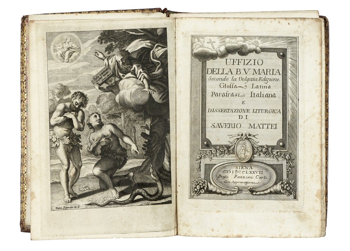 In 8° (mm 180x122). Non collazionato, si vende come legatura. Doppia pagina di dedica impressa in oro, in latino e in italiano, entro graziosa cornice floreale, sottoscritta da Giuseppe e Giovanni Pazzini "sanesi stampatori e librai". Legatura coeva in vitello rosso scuro riccamente decorato in oro e argento (ossidato), armi di Maria Luisa di Borbone-Spagna (1745-1792), al centro del piatto superiore lo stemma del Sacro Romano Impero, al centro di quello posteriore le armi borboniche, unghiatura, dentelles e tagli dorati, sguardie marmorizzate. Primi fascicoli quasi sciolti, legatura con qualche abrasione e un po’ stanca al dorso.