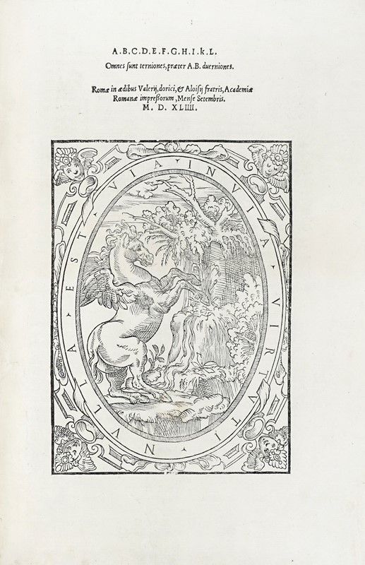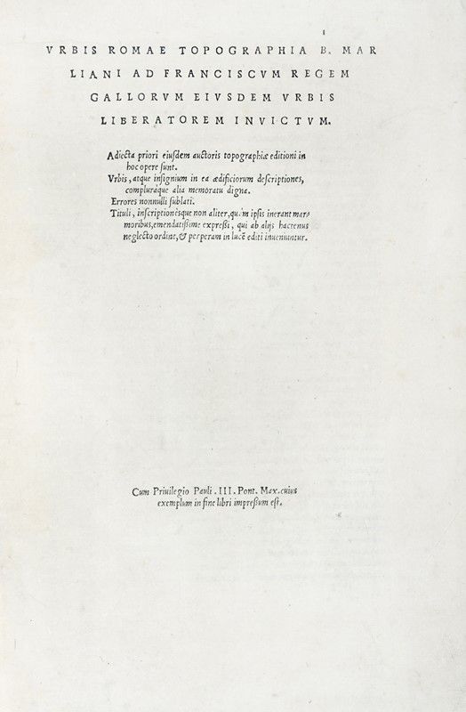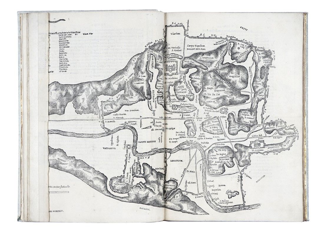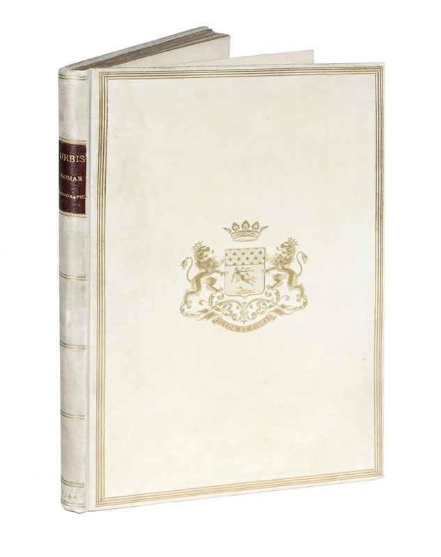 In folio (mm 305x200). Carte 6, pagine 122, [1], 1 bianca. Con alcuni legni a piena pagina nel testo, inclusa una pianta di Roma alle carte B2v-B3r firmata da Giovanni Battista Palatino. Assente una porzione di carta sul margine sinistro della pianta (con pedita di inciso), copia corta di margini ma complessivamente in buono stato conservativo. Legatura ottocentesca in piena pergamena con cornici di triplici filetti impressi in oro ai piatti e titolo in oro su tassello al dorso. Al centro di ciascun piatto armi in oro con motto "victor et fidelis".