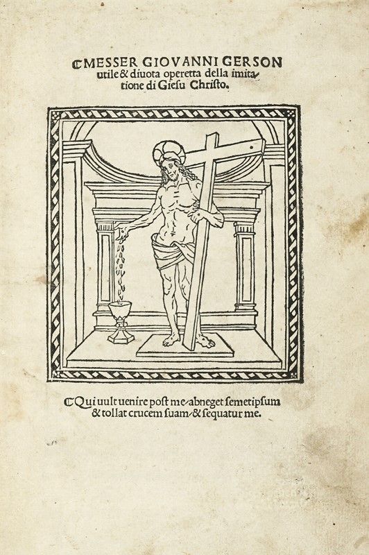 In 4° (mm 209x140). [4] 63 [1] carte. [ ]4 a-h8. Collazionato completo. Al frontespizio grande xilografia raffigurante Cristo con il braccio sinistro reggente la croce e la mano destra sanguinante in un calice, all’interno di una cappella stilizzata (ripresa dall’edizione del 22 luglio 1493 – cfr. lotto n. 242); capilettera xilografici di varie dimensioni, per lo più su fondo nero, marca tipografica in fine. Frontespizio un po’ polveroso e con tracce d’uso, piccola mancanza al margine inferiore della carta successiva, occasionali fioriture/macchiette/tracce d’uso ai margini. Legatura in pergamena antica flessibile di riuso. Provenienza: nota manoscritta "Collezione di Luigi Chiappelli" alla sguardia anteriore; antica nota d’acquisizione al margine inferiore di [ ]2 ("Adi 16 marzo 1696 / Compra il presente libbro Jo Dom.co / Pampani in Firenze in via della / Sant.ma Nonziata"); altra nota di appartenenza al verso della sguardia finale: "Questo libro si è di suor Dimitilla di [Gomanni di Jacheria Falconcini] perché ladopera pregi idio per lej che cie [...] tanto picolina aco che venga a porto di salute che le sua dua sorelle perché idio cene faci degne".