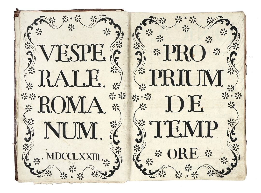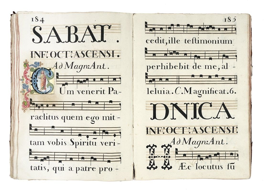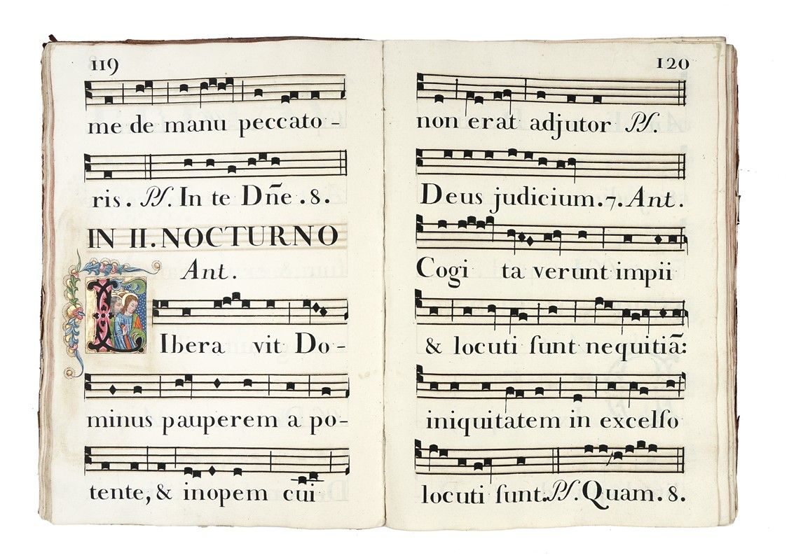 In-folio (mm 285x410). Carte [7], 160, [3]. Manoscritto cartaceo a inchiostro nero. Notazione musicale quadrata su tetragrammi. 9 capilettera istoriati e decorati in oro e inchiostri policromi, contornate da motivi floreali; 26 iniziali decorate a inchiostri policromi e oro. Molte decorazioni floreali a inchiostro nero, ai capilettera e a bordo pagina. Piccoli strappi all’angolo sup. dx di pag. 157 e 211. Alcuni segni di matita azzurra sui primi fogli bianchi. Legatura coeva in piena pelle liscia a 8 nervi, su piatti cartonati, con marcati segni di usura.