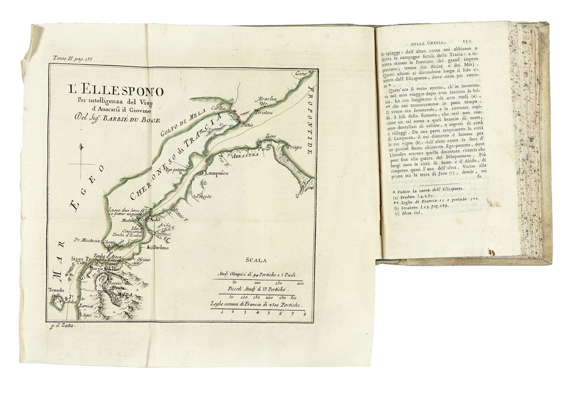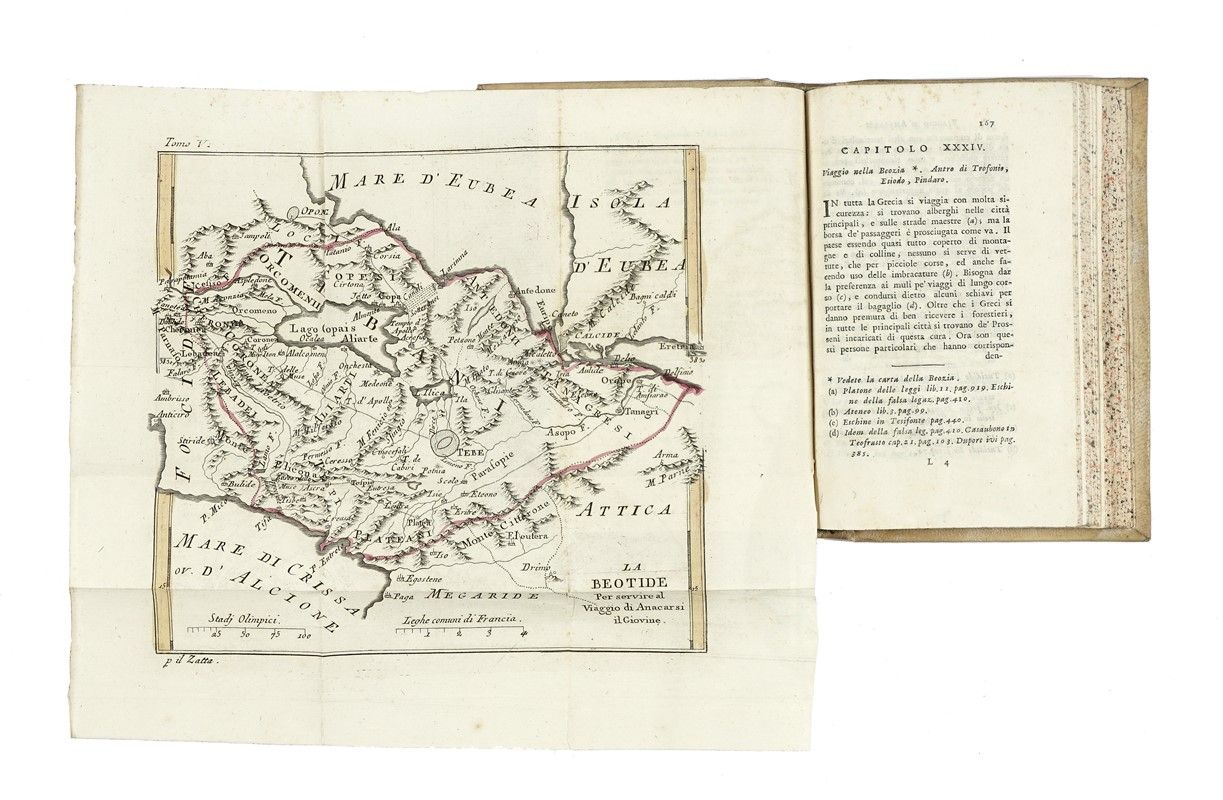 12 volumi in-8° (mm 158x98). Pagine XVI, 307 [i.e. 309], [1]; 300, [4]; 288; 296; 311, [1]; [4], 332; [8], 304; [8], 312; [6], 344; [8], 360; [8], 359, [1]; [VIII], 384 + 31 carte di mappe incise in rame fuori testo, ripiegate e in coloritura. Lavoro di tarlo marginale riparato alle ultime 30 carte del IX volume, privo anche della prima carta bianca, qualche strappetto marginale alle tavole ma per il resto ottimo esemplare. Legatura coeva in piena pergamena rigida con titoli oro su falso tassello al dorso. Ex-libris Carpaneto applicato al contropiatto.