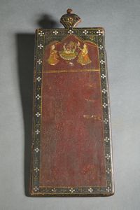 Rettangolare, terminante con impugnatura a ventaglio, il fronte dipinto di rosso e decorato con raffigurazione [..]