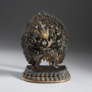 in bronzo brunito e policromo raffigurante Kalachakra nella forma irata in un abbraccio dinamico con la sua paredra [..]