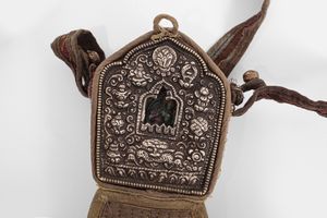 Reliquiario buddista in forma circolare, coperchio incernierato e sbalzato con gli 8 emblemi buddisti disposti [..]