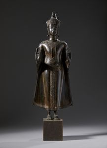La figura indossa abiti monastici elegantemente e sobriamente dettagliati nello stile Ayutthaya ma eseguito posteriormente [..]
