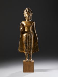 Buddha in piedi con la mano destra alzata nel gesto di pacificazione ed il braccio sinistro disteso lungo il fianco. [..]