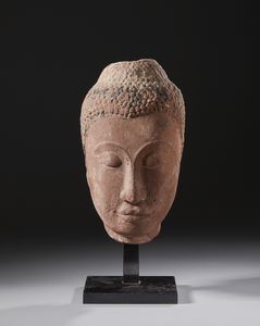 La possente scultura in gres rosa-crema (tipo di arenaria particolarmente dura) raffigura un raro Lokeshvara con [..]