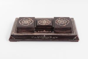Bella scatola in legno duro finemente intarsiata in madreperla. la parte centrale entro riserva è caratterizzata [..]