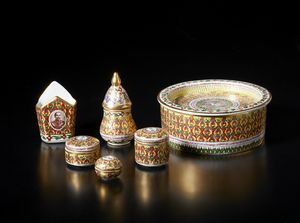 Formato da cinque scatole e un contenitore dipinto col tipico decoro Benjarong. il termine sottolinea l'uso di [..]